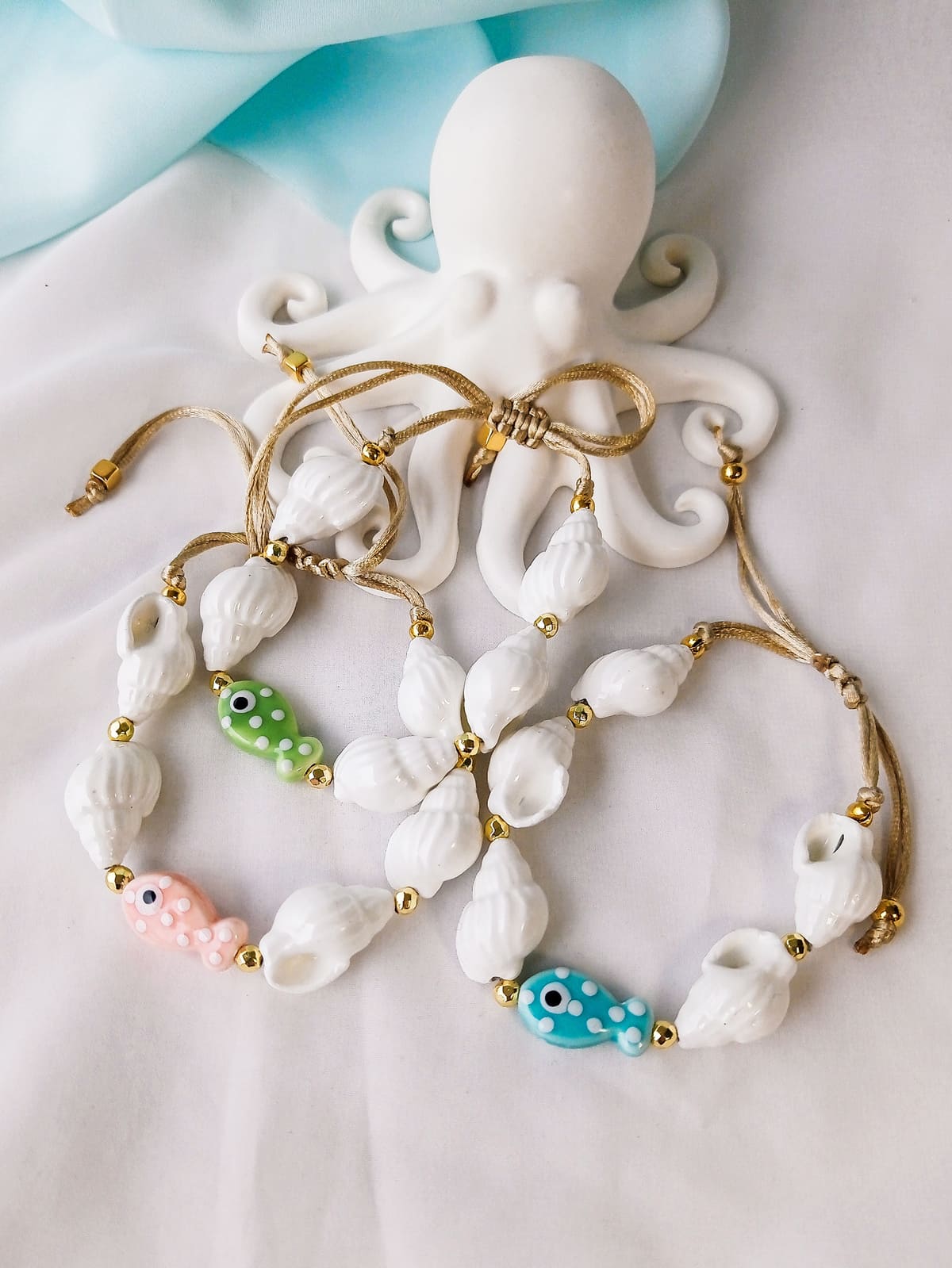 Λευκές κεραμικές αχιβάδες συνδυασμένες με κεραμικά πουά ψαράκια σε καλοκαιρινά χρώματα και επίχρυσο αιματίτη. Περασμένα σε ατσαλόσυρμα και δεμένα με μπεζ σατέν κορδόνι.
