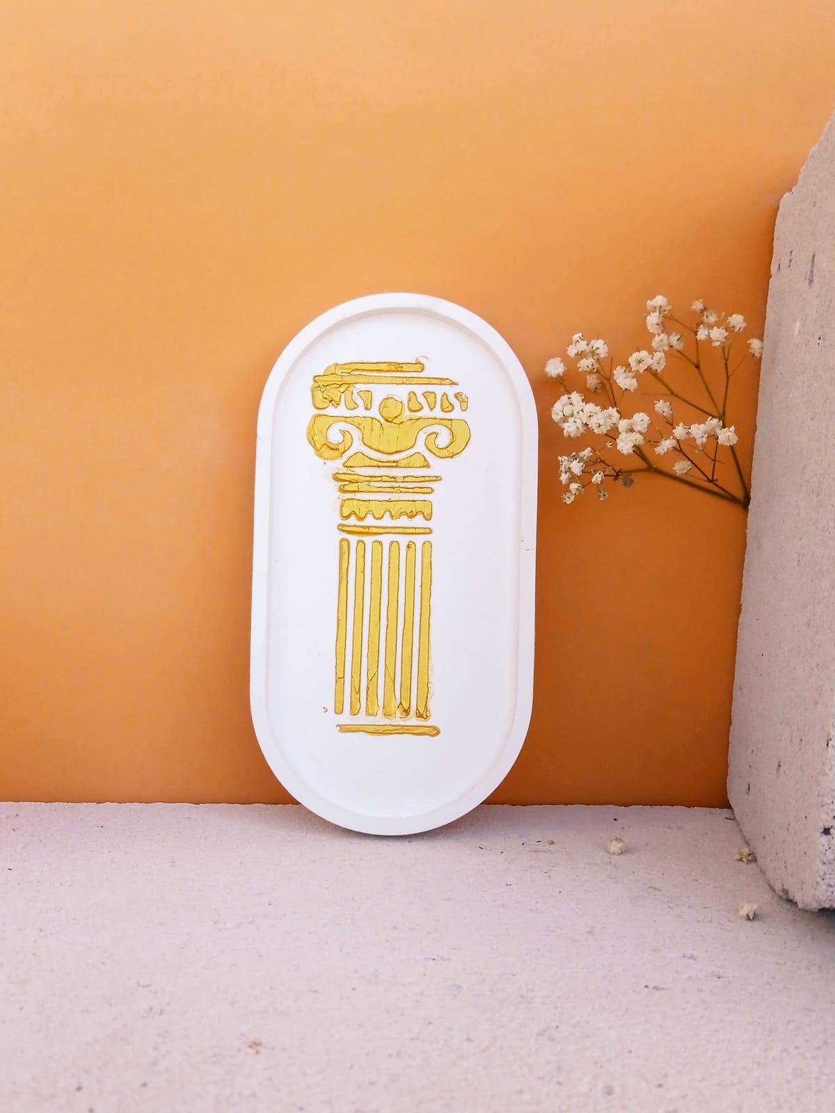 Ο Ionic Column Tray είναι ένας κεραμικός οβάλ δίσκος εμπνευσμένος από την κλασική αρχιτεκτονική της αρχαίας Ελλάδας. Το σχέδιο απεικονίζει έναν Ιωνικό κίονα, ένα από τα πιο χαρακτηριστικά στοιχεία της ελληνικής αρχιτεκτονικής, αποτυπωμένο με χρυσό ακρυλικό χρώμα μέσω τεχνικής stencil.