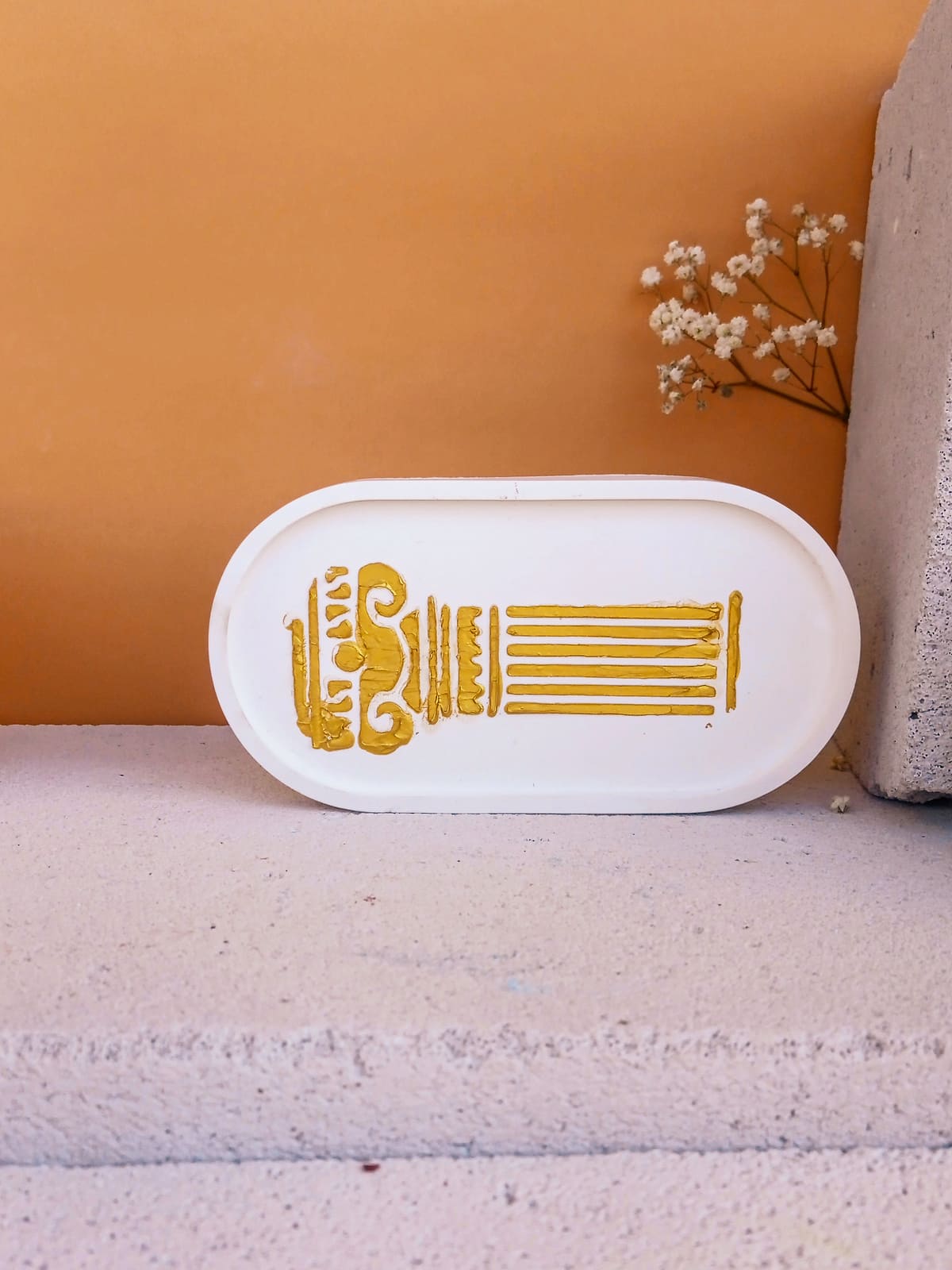 Η καθαρή λευκή επιφάνεια σε συνδυασμό με τη χρυσή λεπτομέρεια δημιουργεί ένα κομψό αντικείμενο που ισορροπεί ανάμεσα στη διαχρονική ελληνική κληρονομιά και το σύγχρονο design.