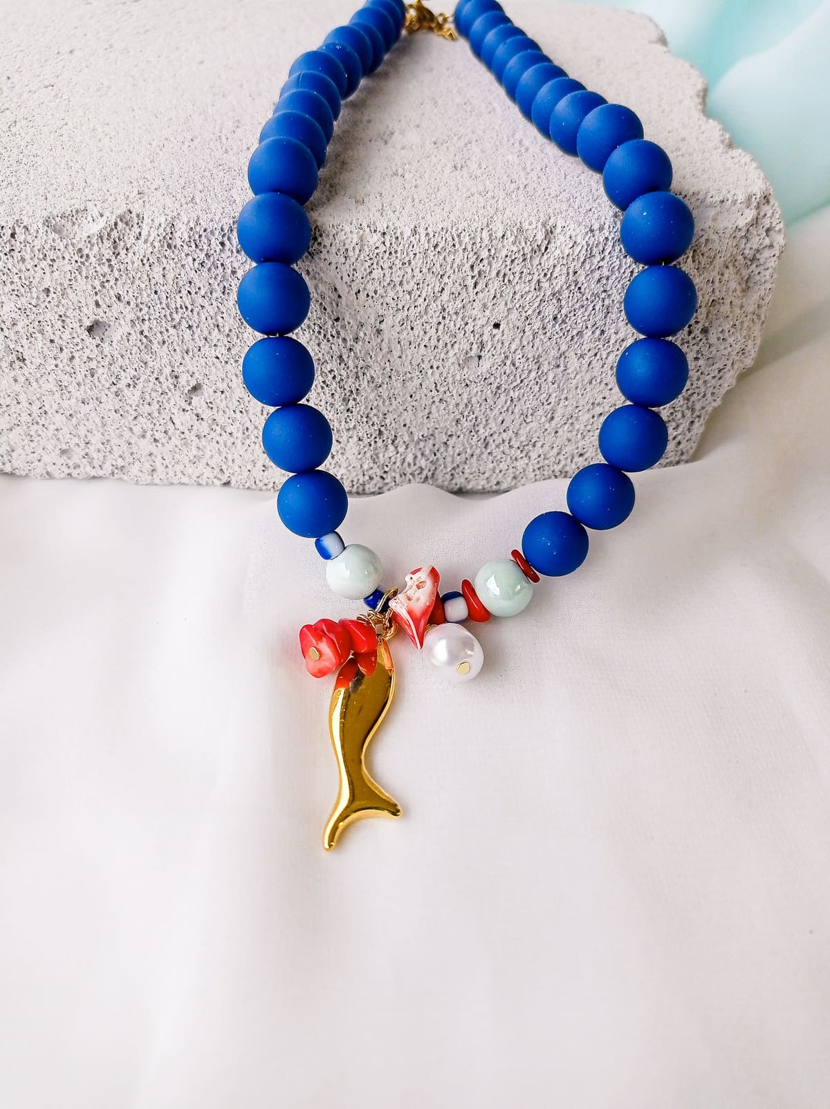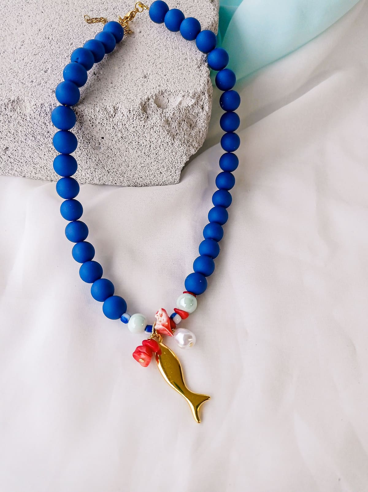 μπλε rubber χάντρες  10mm έχουν συνδυαστεί με κεραμικές, κοράλλια και πέρλα. Στην μέση έχει κρεμαστεί ένα επίχρυσο στοιχείο ψάρι.