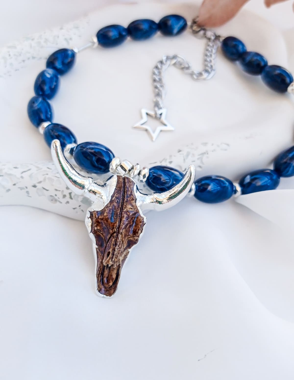 κολιέ με μπλε πέτρες και κεφάλι βουβαλιού