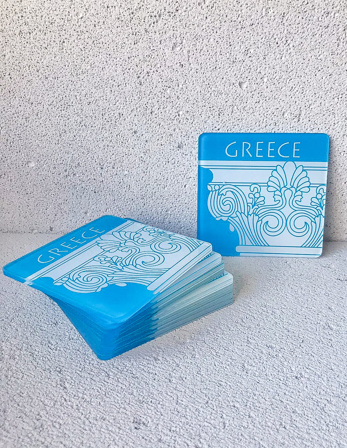 Τα Greece Coasters είναι μια σύγχρονη πρόταση διακοσμητικών και χρηστικών αντικειμένων εμπνευσμένων από την ελληνική αισθητική. Πρόκειται για σουβέρ από plexiglass με εκτύπωση, που συνδυάζουν καθαρές γραμμές, φωτεινά χρώματα και μοτίβα εμπνευσμένα από την Ελλάδα και το καλοκαιρινό της ύφος.